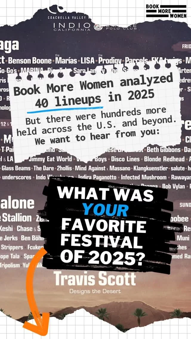 This number is based on Book More Womenโs original research, obtained by aggregating results of the 2024 lineups for ten of the largest multi-genre US music festivals: Austin City Limits, Bonnaroo, Boston Calling, Bottlerock, Bourbon & Beyond, Coachella, Governors Ball, Hangout, Lollapalooza, and Outside Lands using the 2024 METHOD.